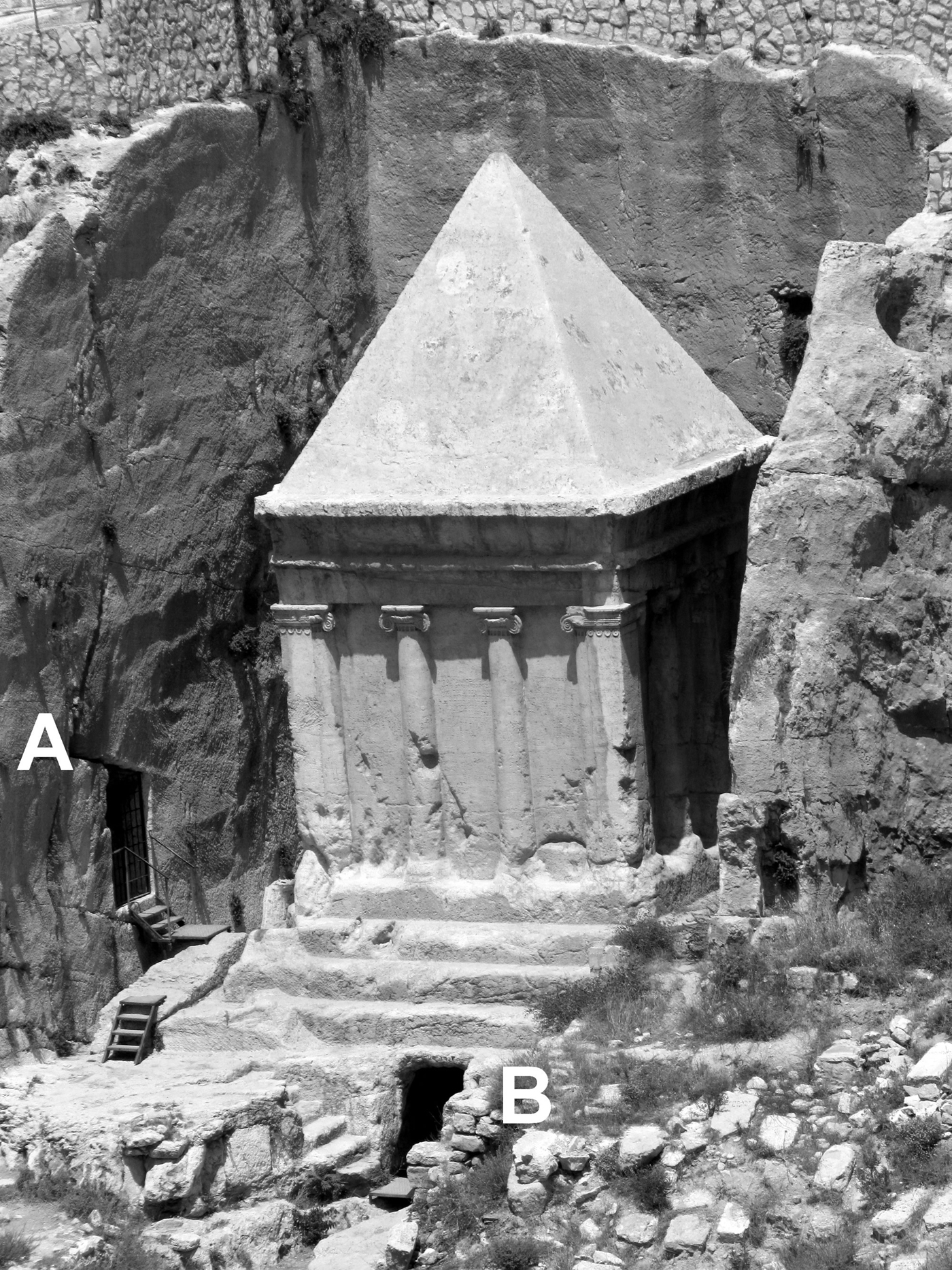 Zechariah's Tomb is a cube cut out of the rock in the Kidron Valley druing the life of Jesu with Ionic pilasters and a pyramid top. "A" in the photo above marks a corridor with steps that provides access to the tomb of the Hezir family to the left. "B" marks a small chamber cut under the base to serve as a tomb. To the right (south) is a tomb that was never finished. This monument (called "Zechariah's Tomb") may have been built to honor those who would be buried in the unfinished tomb to the south.