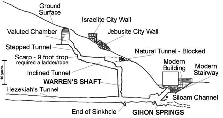This is a diagram of Warren's Shaft that connects the Gihon Springs water system with the area inside the ancient City of David, or Salem. Joab would have used this shaft to enter Jerusalem when David conquered the city in 2 Samuel 5:8.