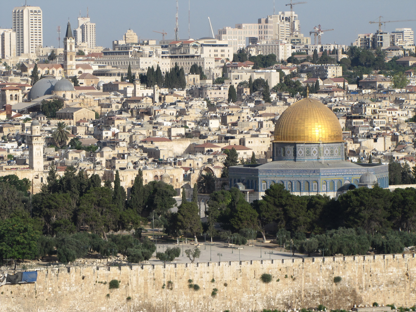 A view of Jerusalem from the Mount of Olives. The two grey domes to the far left are roofs over Calvary and tomb of Jesus in the Church of the Holy Sepulcher. The gold dome of the Dome of the Rock sets where the Jewish temple stood on the Temple Mount.