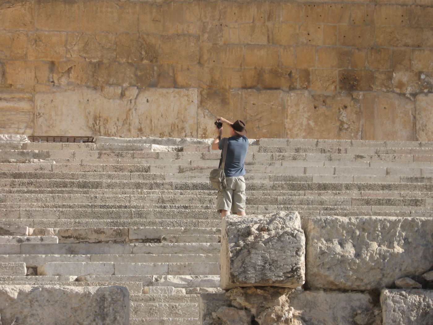 Here Galyn is photographing the south side of the Temple Mount wall while standing on the monumental staircase used by Jews during New Testament times to access the Temple. Notice the large first course of Herodian Ashlar stones at the top of the stairs. This was the master course that helped stabilize the wall. Those master course ashlars are original from Herod's Temple.