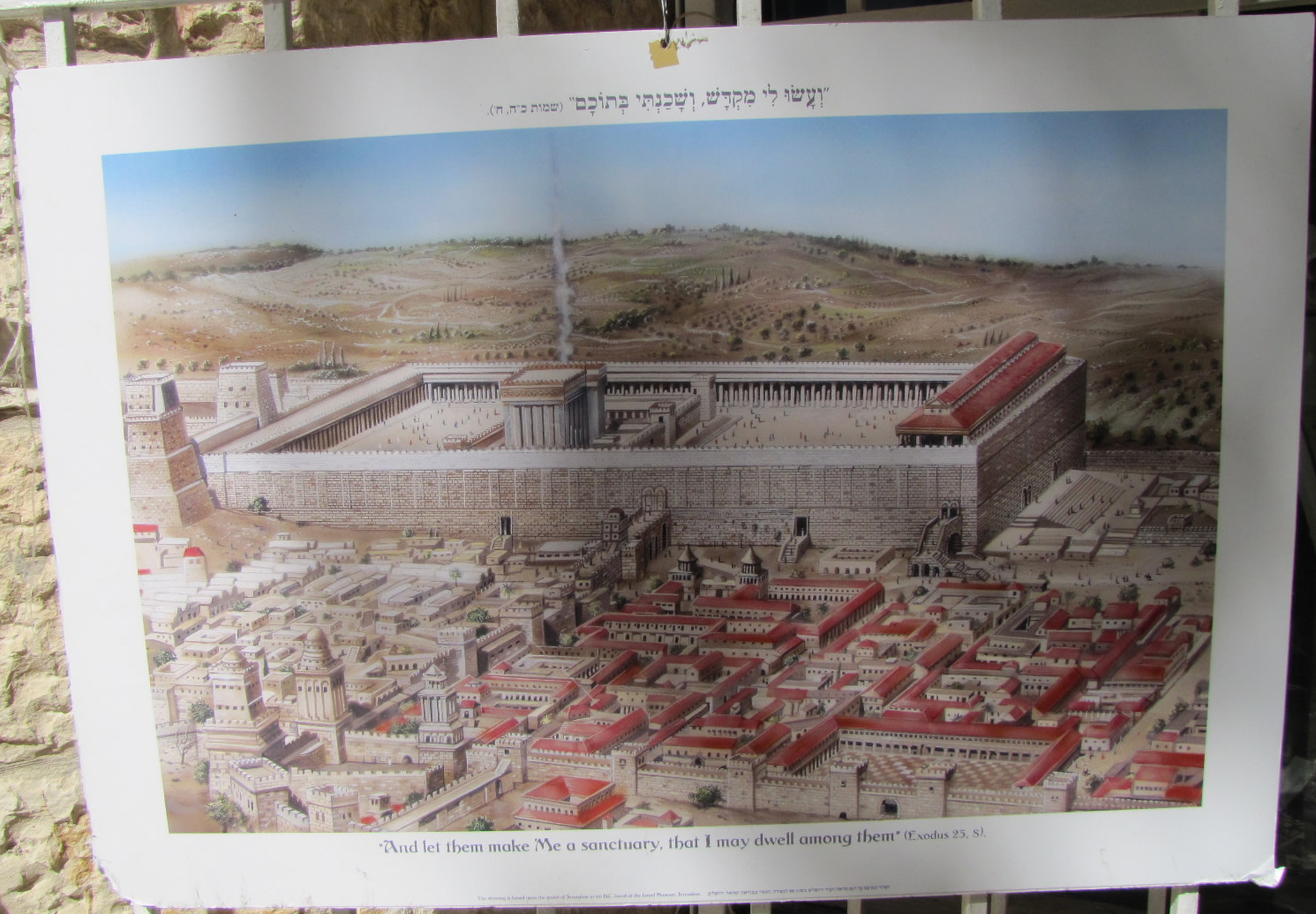 A photo of an artist's hanging in the streets of the Jewish Quarter showing an interpretation of the appearance of the first century Temple.