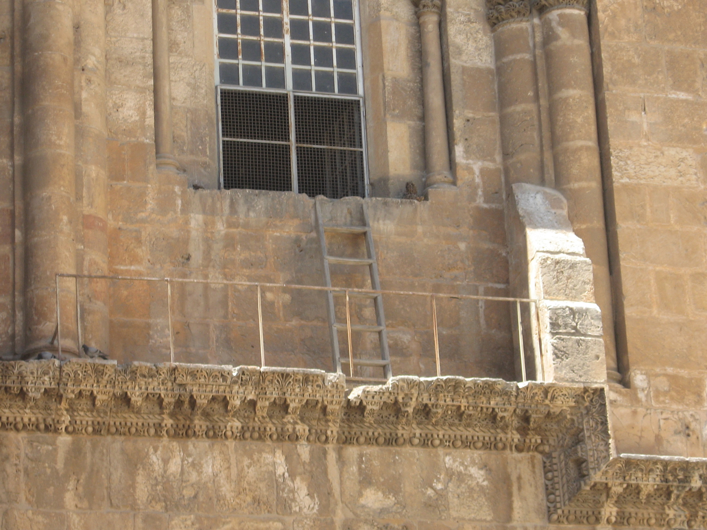 This ladder that is leaning against the window of the Church of the Holy Sepulcher was placed here in 1852, but when the status quo was established in 1853 to determine which Christian sect control which part of this church, the doors and window ledges were defined as common ground. No one has the right to move this ladder, and the Christians sects cannot agree who can touch or move the ladder. It can be seen in the very first photographs ever taken.