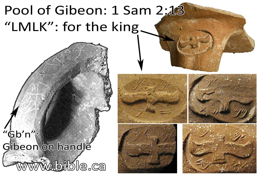 The biblical sites of Gibeon and the Pool of Gibeon have been identified six miles north of Jerusalem. Thirty-one jar handles inscribed with the Hebrew name gb’n, or Gibeon, where found here along with an 82 foot deep pool, or water shaft, that was 37 feet in diameter. This is the location mentioned in 2 Samuel 2:13 and Jeremiah 41:12. (Details here, here and here. Photos.