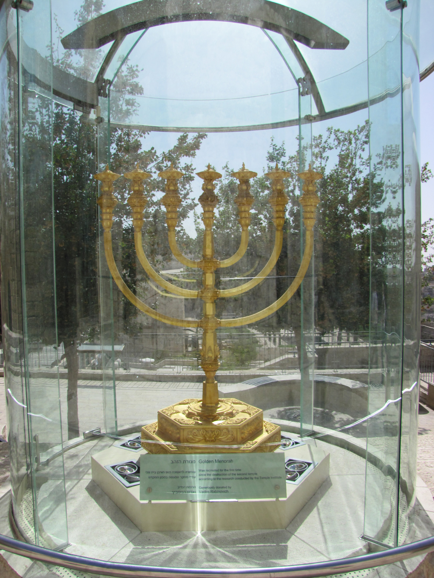 The golden candle stand, or the seven branched golden menorah, prepared for the rebuilt Jewish temple. This was created and is maintained by the Temple Institute located in Jerusalem and online here. See the Temple Institutes temple furniture, including this candle stand, for the new temple here.