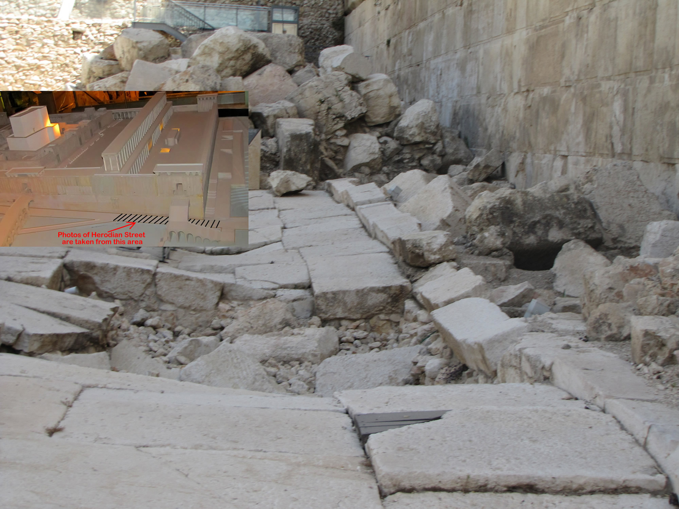 The actual pavement crushed in 70 AD with a model of this Western Wall, the Temple Mount and this same road inset into the photo. The crushed pavement and the rubble is the actual result of the Roman's destruction of the Temple in 70 AD.