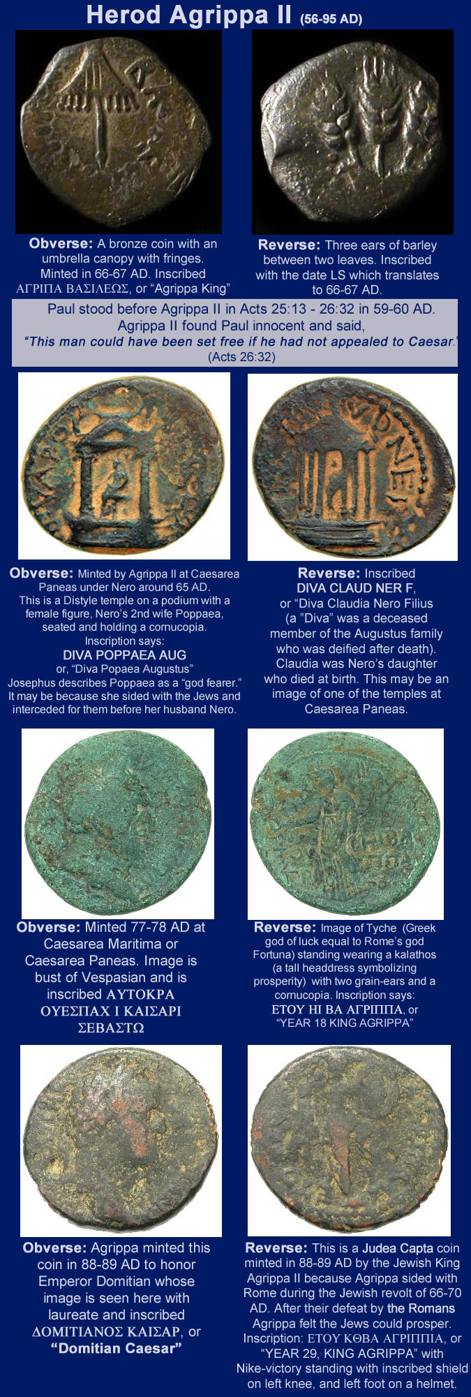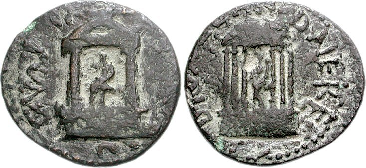 A Galley (ship) commemorates Herod Archelaus’ voyage to Rome at the start of his reign to secure his position as king since his father, Herod the Great, had altered his will in his final hours to remove Archelaus. The galley (ship) was on the coins to remind the Jews that Rome approved Archelaus’ reign. The galley also has an aphlaston (the upward curving stern of an ancient war ship), oars and a ram. The inscriptions say ETHNARCH on the reverse side and HEROD on the obverse, which also has a double cornucopia adorned with a grape vine. Another symbol that was on Herod Archelaus’ coins was the Caduceus which was the wing-topped staff with two snakes that was carried by Hermes the god who brought messages from the gods to men since the Caduceus was a symbol for truce, neutrality and Archelaus wanted to maintain that non-combative status with Rome. It was understood that Apollo had given to Archelaus.