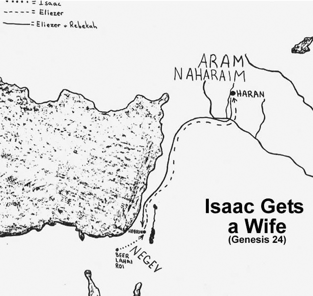 Details on a map of the journey taken by Abraham's servant to find a wife for Isaac.