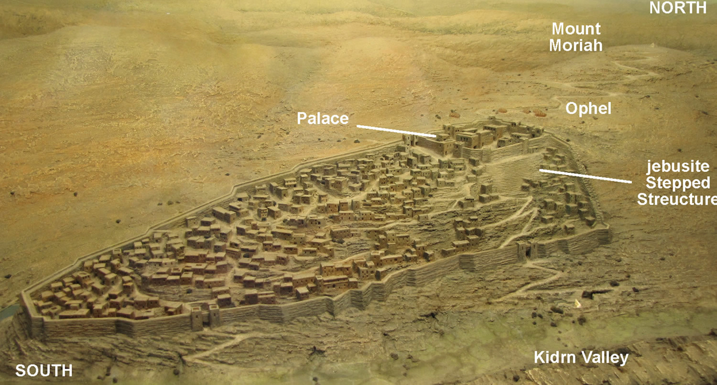Details labeled on a model of the ancient city of Salem (Jerusalem) or the city David took from the Jebusites to establish as the center of his kingdom.