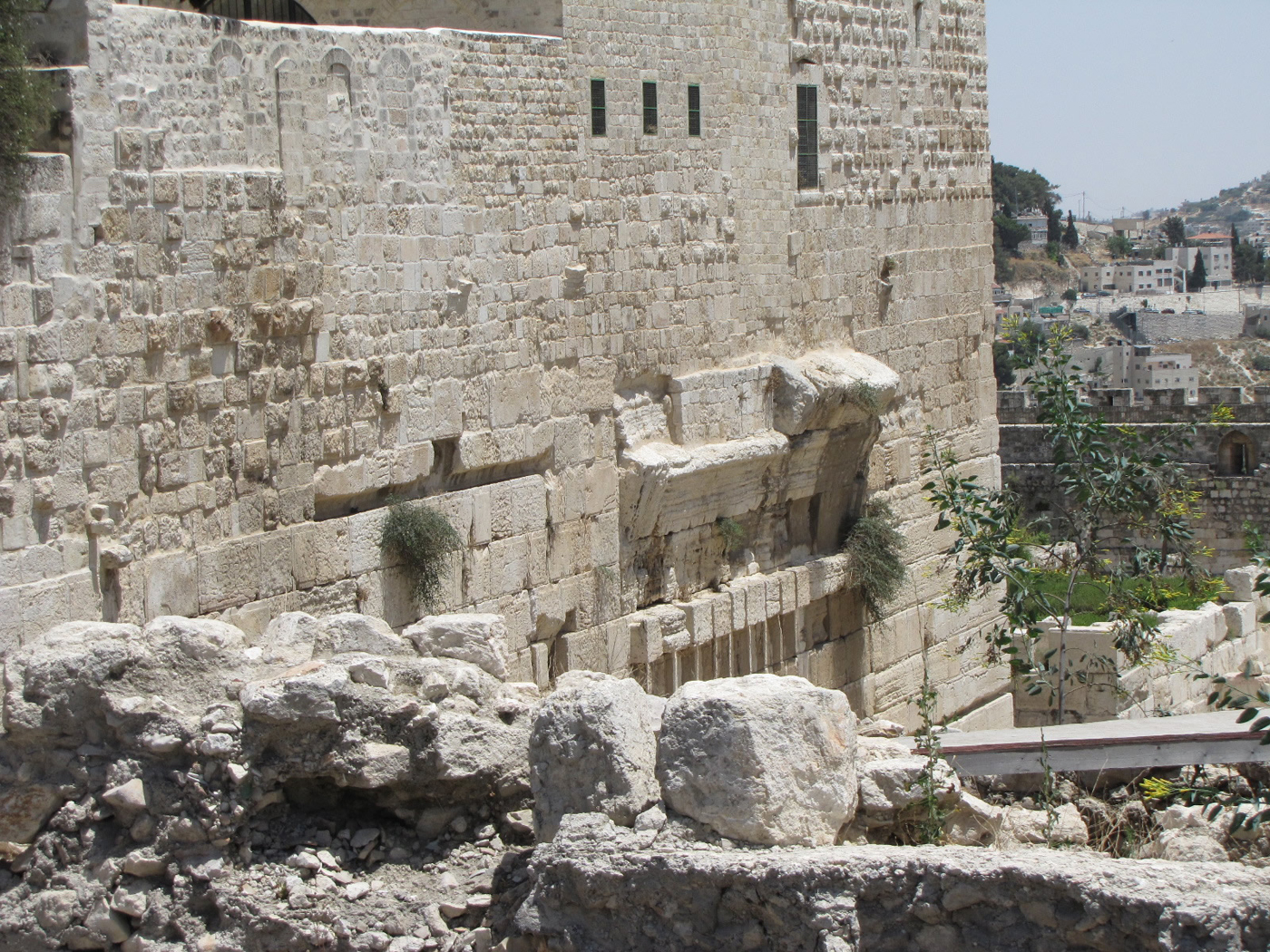 The Herodian ashlar stones in the retaining walls of the Temple Mount visible to pedestrians at street level and above were trimmed with margins 3-6 inches wide that framed a flat chiseled central boss raised about ½-1 inch. The ashlars below street level had wider margins surrounding the bosses which had been left rough, unfinished and protruding.