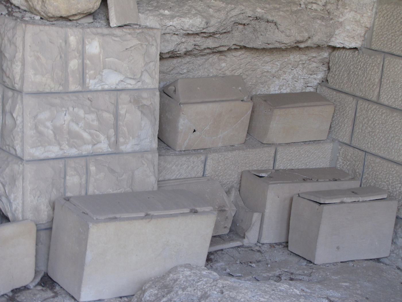 Ossuary boxes on the Mount of Olives. These boxes were used to store the bones after the body had decayed after about a year of laying on a burial bench in the tomb. The bones were gathered after about a year to be placed in an ossuary box which was left in the family tomb.
