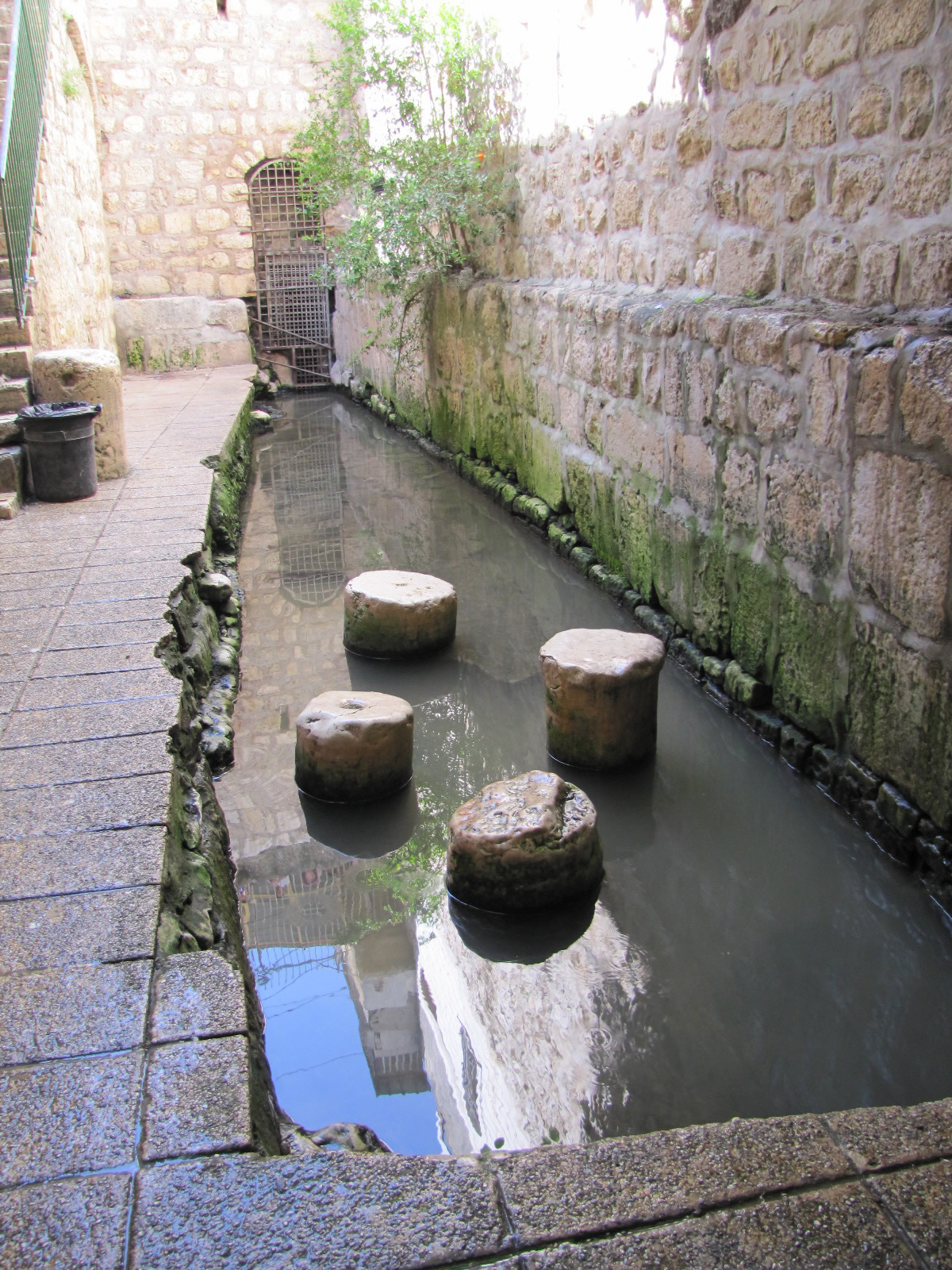 This is a view of a water channel just outside the exit of Hezekiah's tunnel that leads to the Pool of Siloam. The column bases are the remains of the Siloam Church built by Byzantine Christians in the 300's AD.