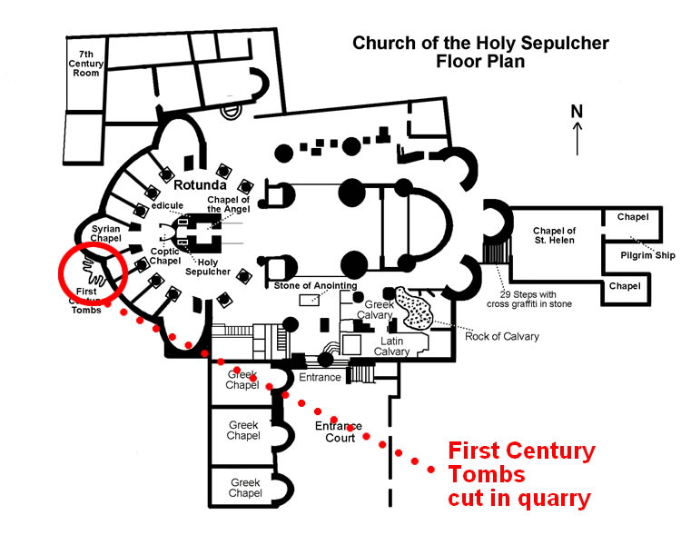 Diagram of the Church of the Holy Sepulcher showing the location of tombs that still exist from the first century.