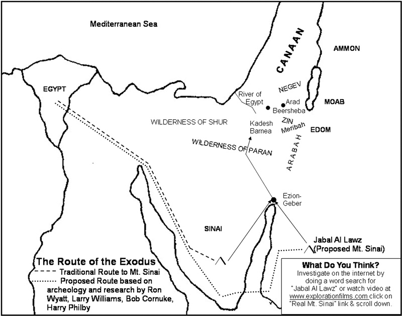 This map shows the traditional route of the Exodus and a questionable alternative route to an alternative Mount Sinai.