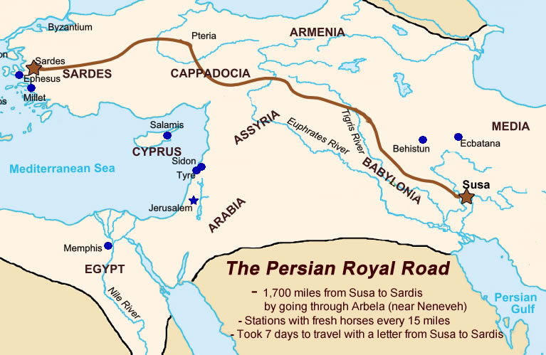 The Persians designed a highway system, or The Persian Royal Road. It ran 1,700 miles from Susa through Arbela (near Nineveh) to Sardis on the cost of the Agean Sea. The road was paved in necessary places, maintained by the state and had stations posted every 15 miles so the couriers could get a fresh horse. (The Persians invented horseshoes for this road.) A letter would travel from Sardis to Susa in 7 days. In other words it was possible to communicate between Jerusalem and Susa, or between the land of Judah and Babylon in a matter of days. (Maps)