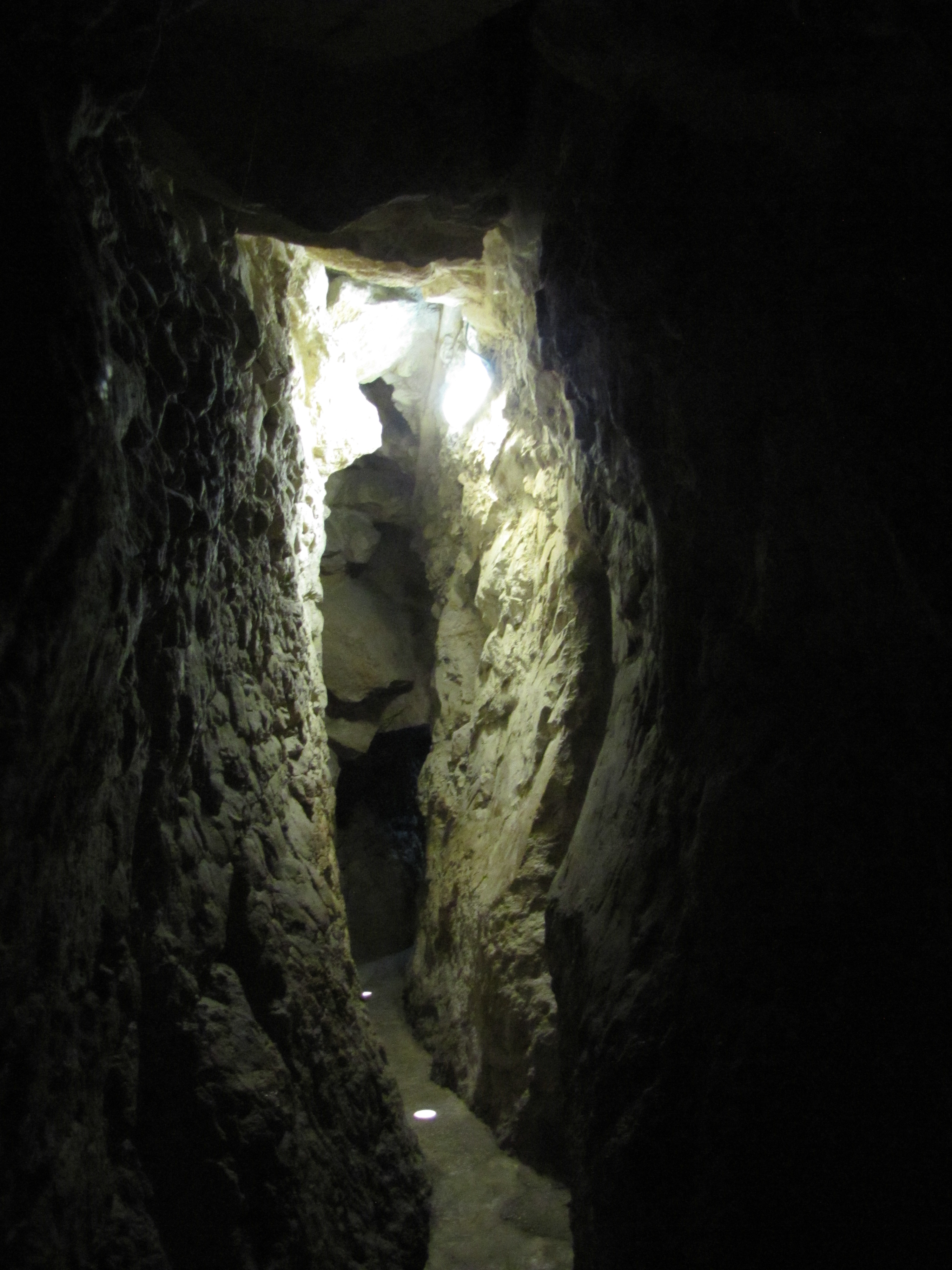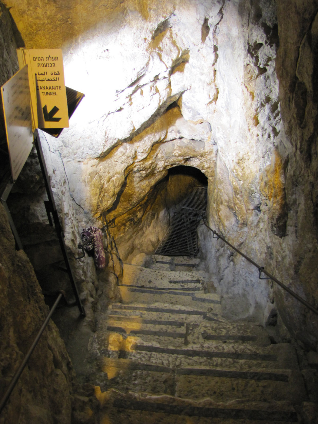 An ancient tunnel cut through rock leading down to the pool of Siloam and the beginning of Hezekiah's Tunnel. To the left side of this photo the entrance to an ancient Canaanite Tunnel can be seen. This tunnel was dug during the days of Jacob and Joseph by the Canaanites around 1700 BC. Today this tunnel is dry. (more photos of Canaanite Tunnel)