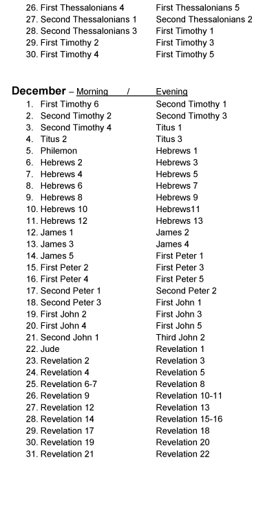 A daily devotion for the morning and for the evening for every day of the year. The devotions progress chronologically through the Bible and are based on text verses taken from every book of the Bible. The daily progression through the Bible can be seen on this .pdf online with the text verse listed by the day it is used Devotion Chapter/Text Verse Yearly Schedule