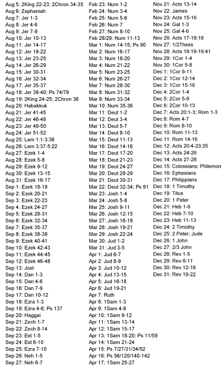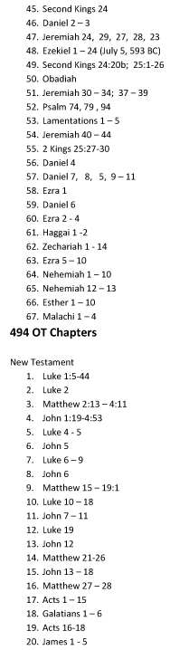 COMPLETE TEXT - Read 3-4 chapters a day (1-2 morning, 2 evening) to read through the entire text of Scripture in Chronological order. A link to a .pdf with all the scripture references is here.