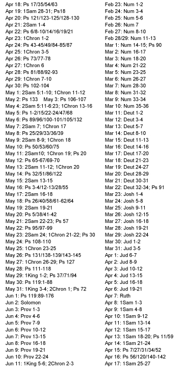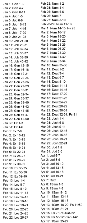 NARRATIVE - Read one chapter a day (mornings only) to read chronologically through the entire narrative or storyline of the Bible. The program follows chronological order through Genesis, Exodus, etc., Joshua, Judges, Samuel, Kings, etc., Gospels and Acts. A link to a .pdf with all the scripture references is here.