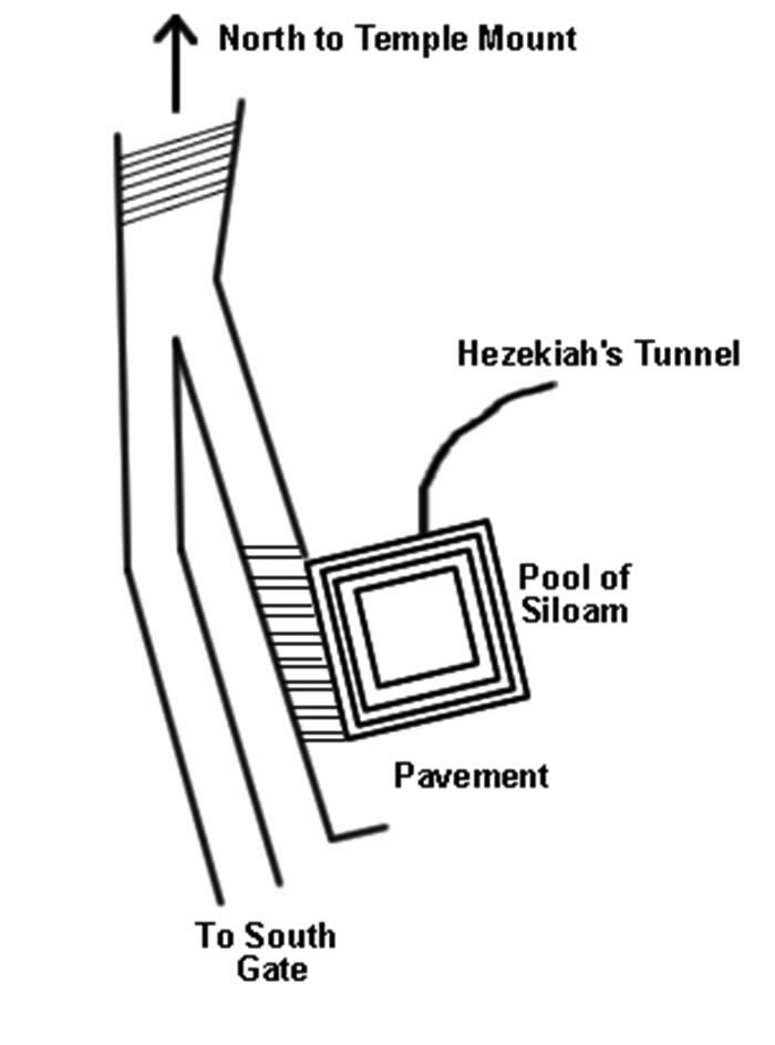 Details of the steps/road leading north to the Temple Mount and the position of the Pool of Siloam and Hezekiah's Tunnel.