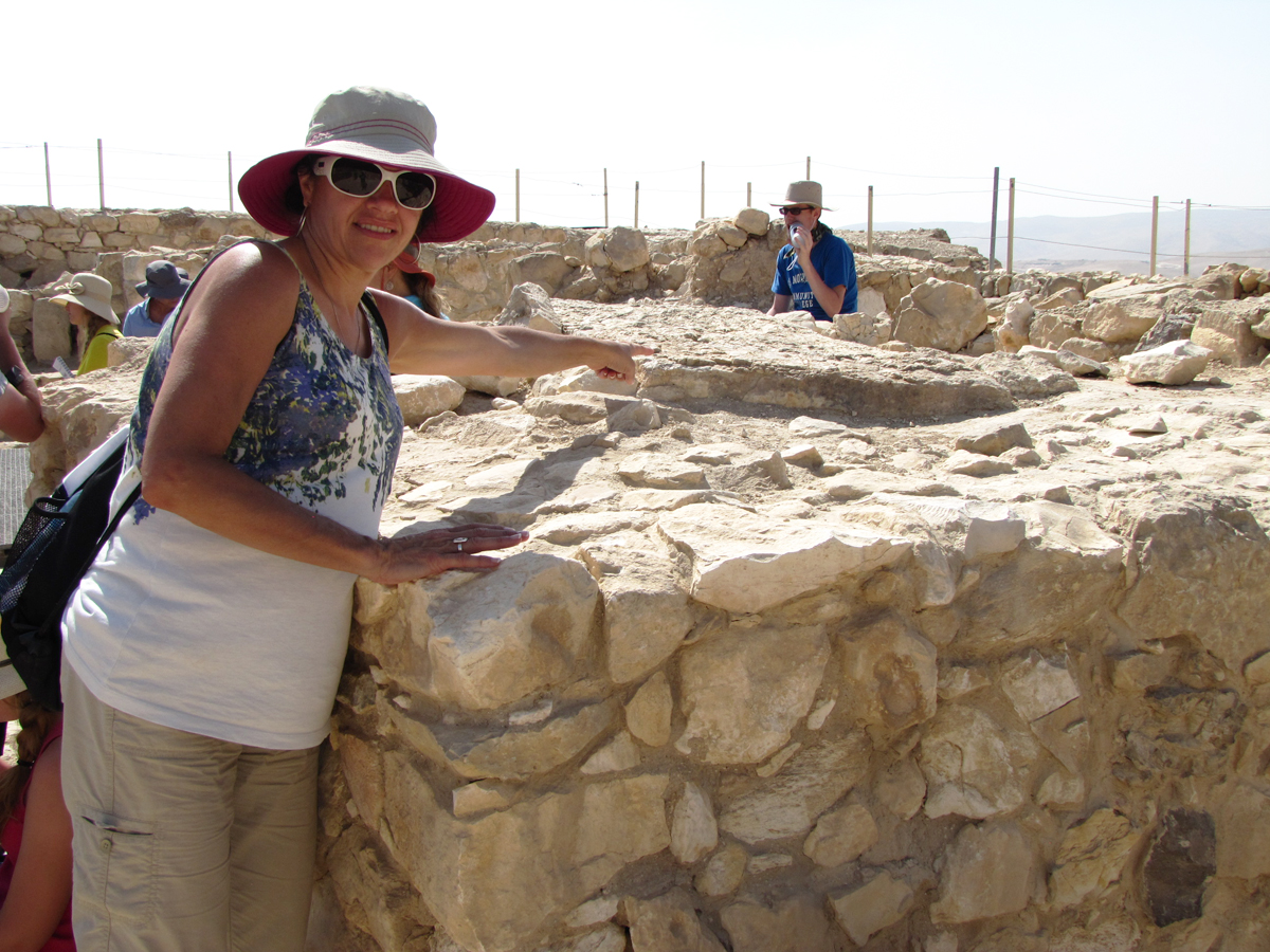 Toni points at the covering stone of the sacrificial altar located in the imitation temple, or the High Place, in Arad from 700 BC. This altar had been buried in the days of Hezekiah or Josaih to prevent its use in false worship.