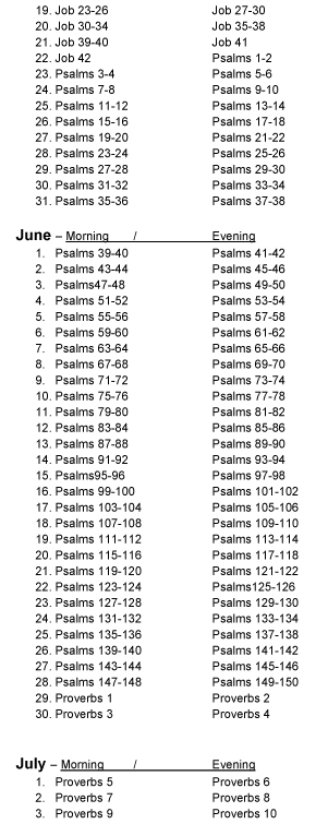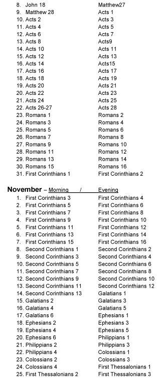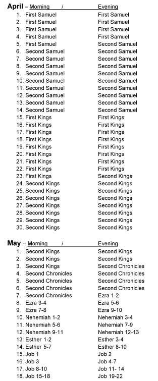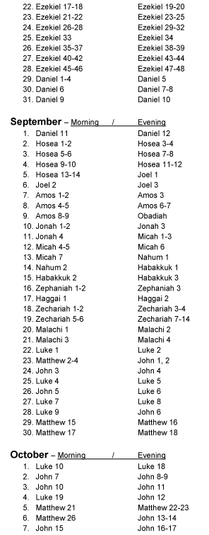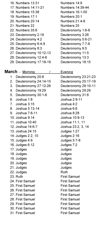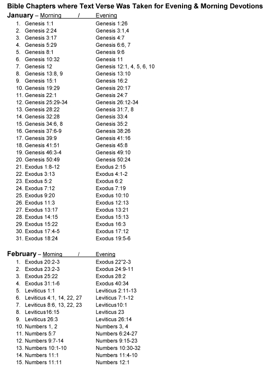 A daily devotion for the morning and for the evening for every day of the year. The devotions progress chronologically through the Bible and are based on text verses taken from every book of the Bible. The daily progression through the Bible can be seen on this .pdf online with the text verse listed by the day it is used Devotion Chapter/Text Verse Yearly Schedule