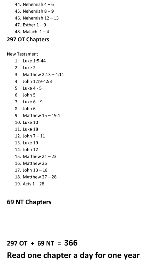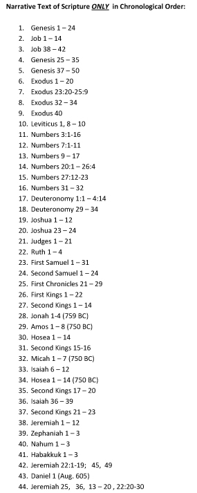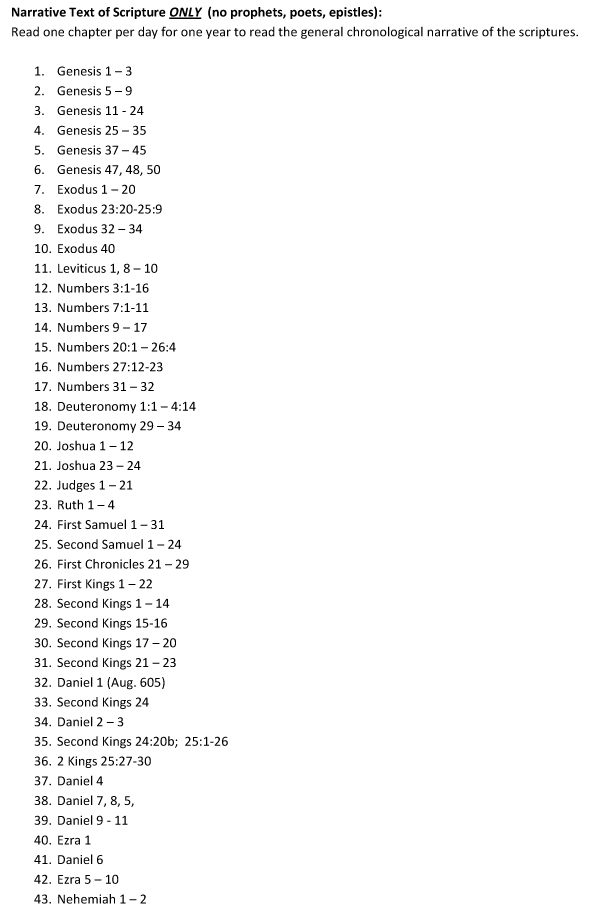 - Read one chapter a day (mornings only) to read chronologically through the entire narrative or storyline of the Bible. The program follows chronological order through Genesis, Exodus, etc., Joshua, Judges, Samuel, Kings, etc., Gospels and Acts. A link to a .pdf with all the scripture references is here.