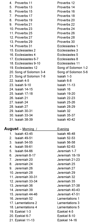 A daily devotion for the morning and for the evening for every day of the year. The devotions progress chronologically through the Bible and are based on text verses taken from every book of the Bible. The daily progression through the Bible can be seen on this .pdf online with the text verse listed by the day it is used Devotion Chapter/Text Verse Yearly Schedule